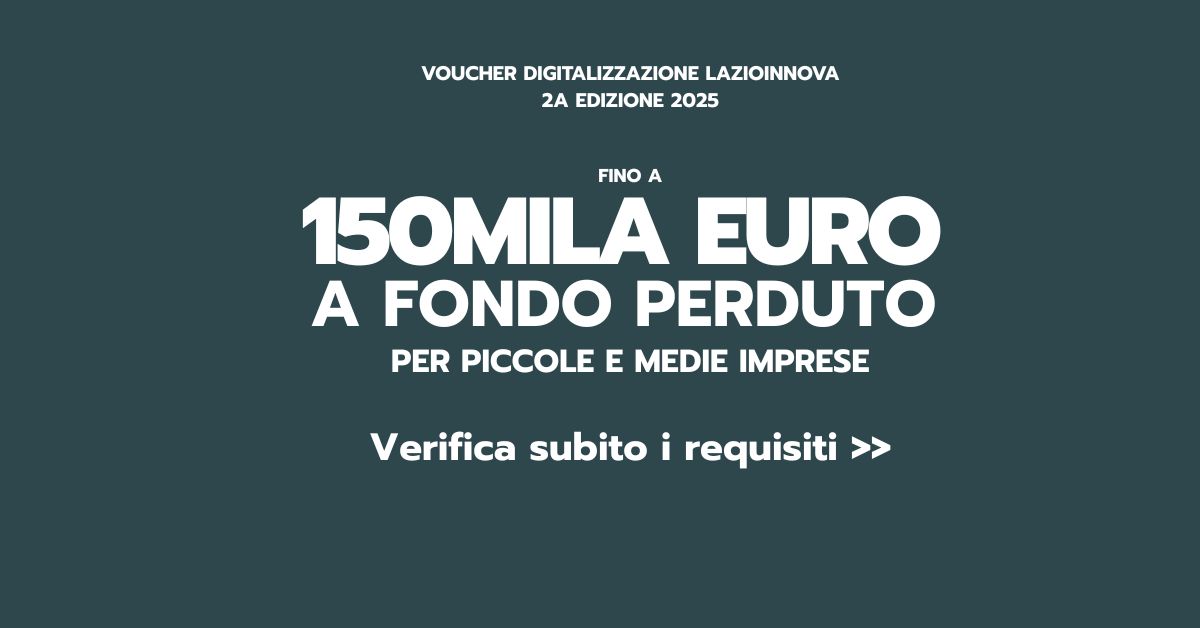 Lazio Innova finanzia progetti di digitalizzazione con un contributo a fondo perduto fino a 100mila euro per piccole imprese e fino a 150mila euro per medie imprese. Riempi questo brevissimo questionario e ti ricontatterò immediatamente per verificare se hai i requisiti per partecipare!